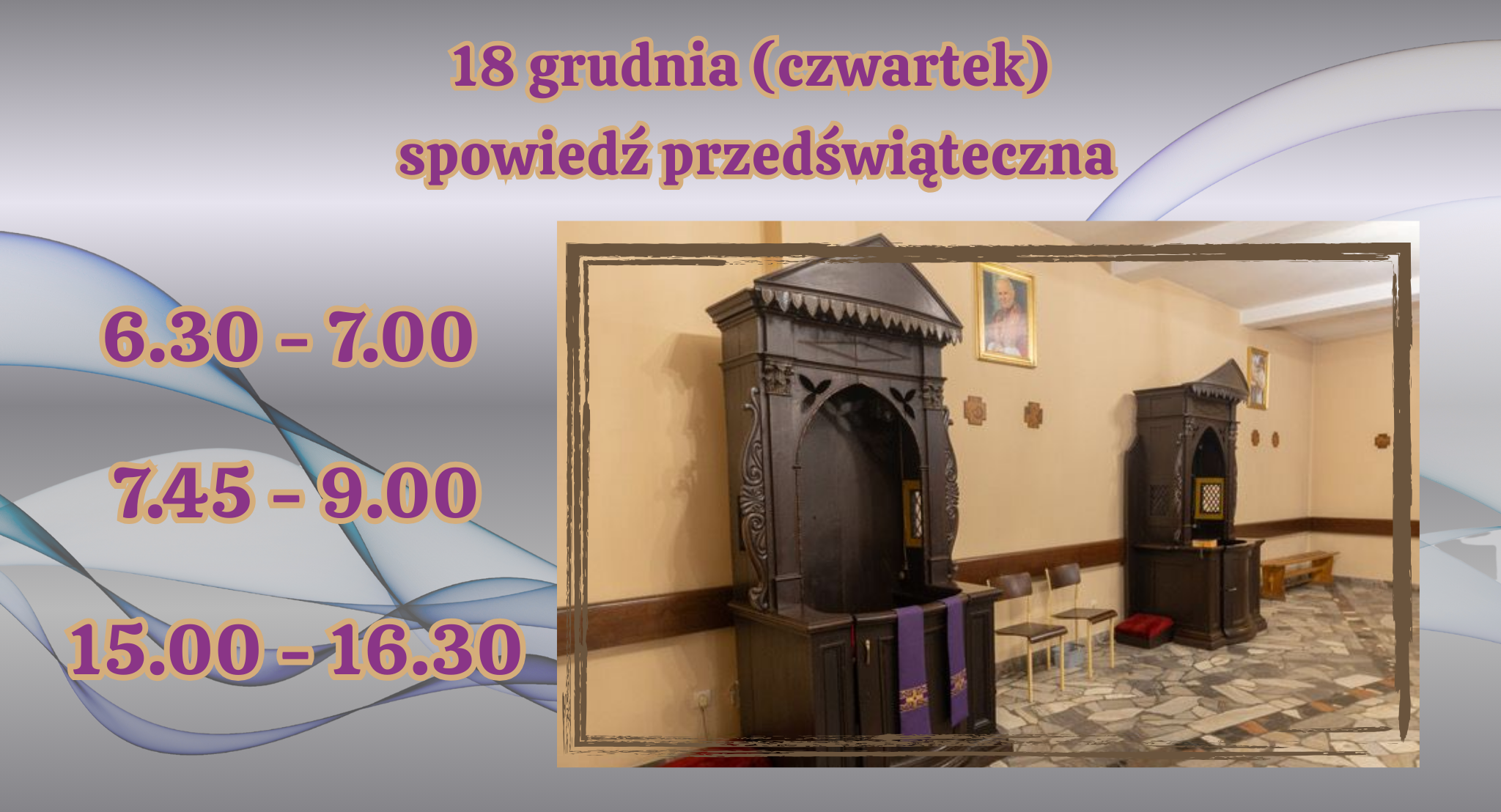 Zachęcamy do przygotowania swoich serc na przyjście Pana Jezusa poprzez przystąpienie do sakramentu pokuty i pojednania – spowiedzi. W naszej parafii dniem spowiedzi przedświątecznej będzie czwartek – 18 grudnia.